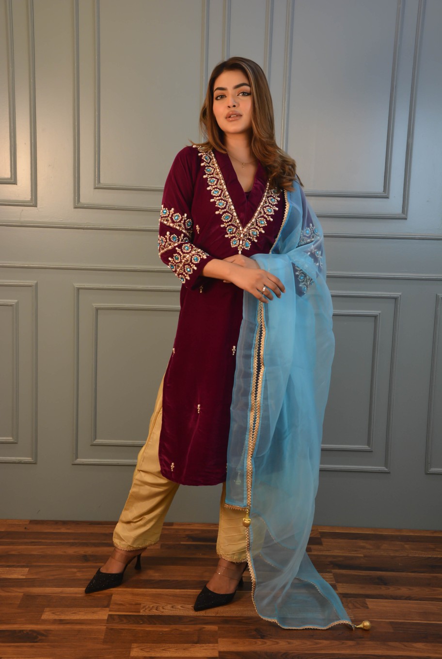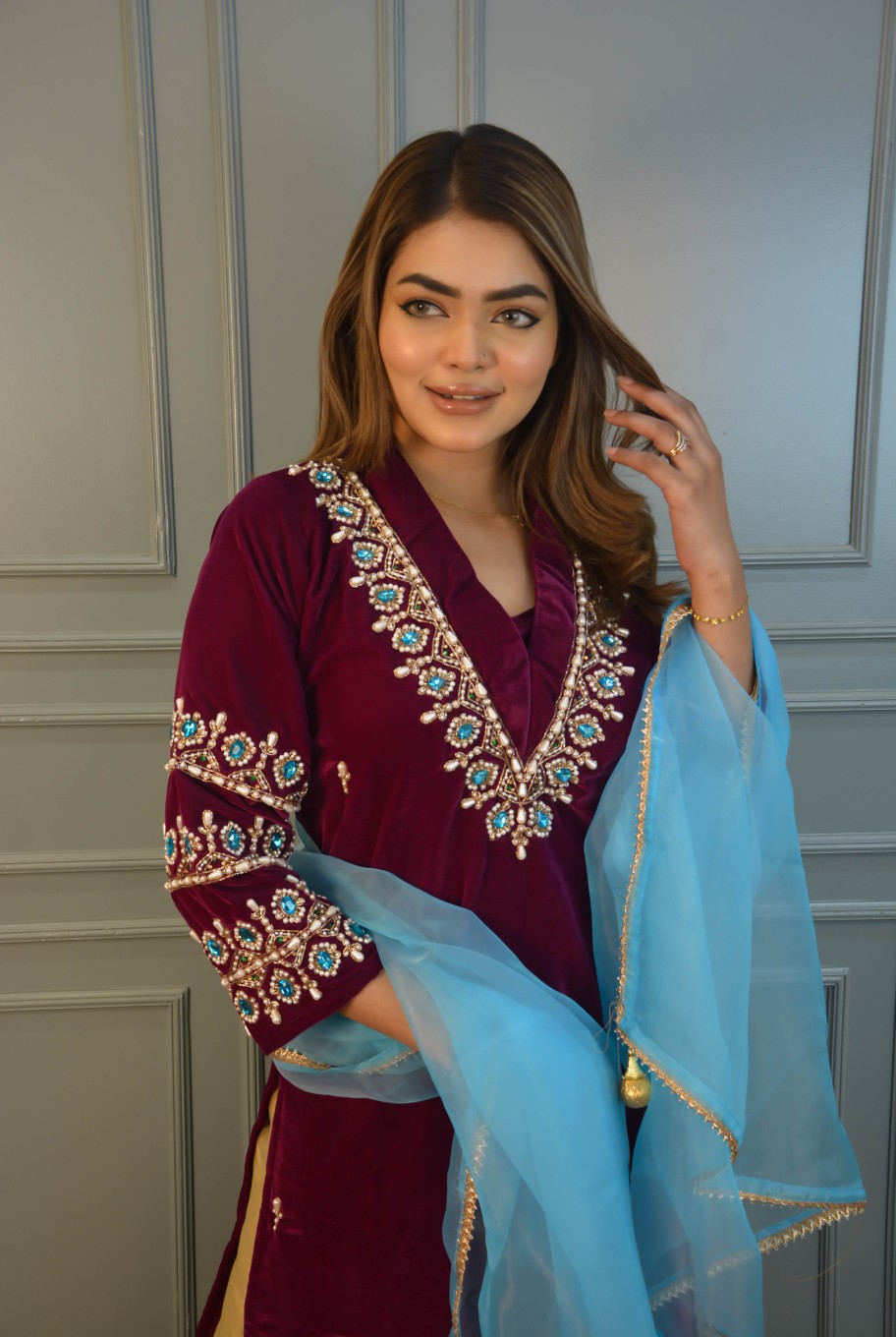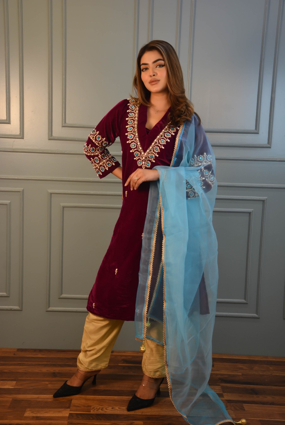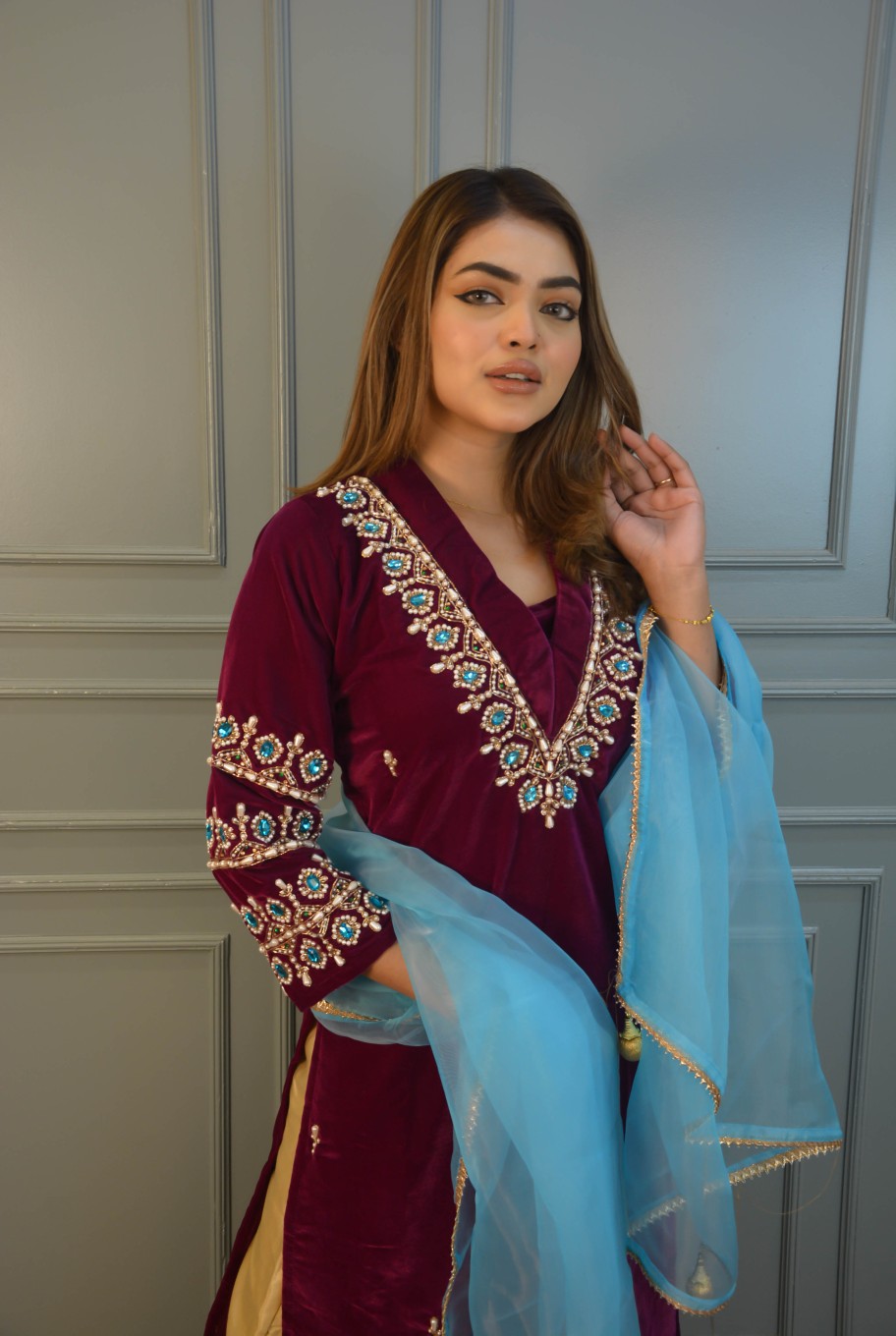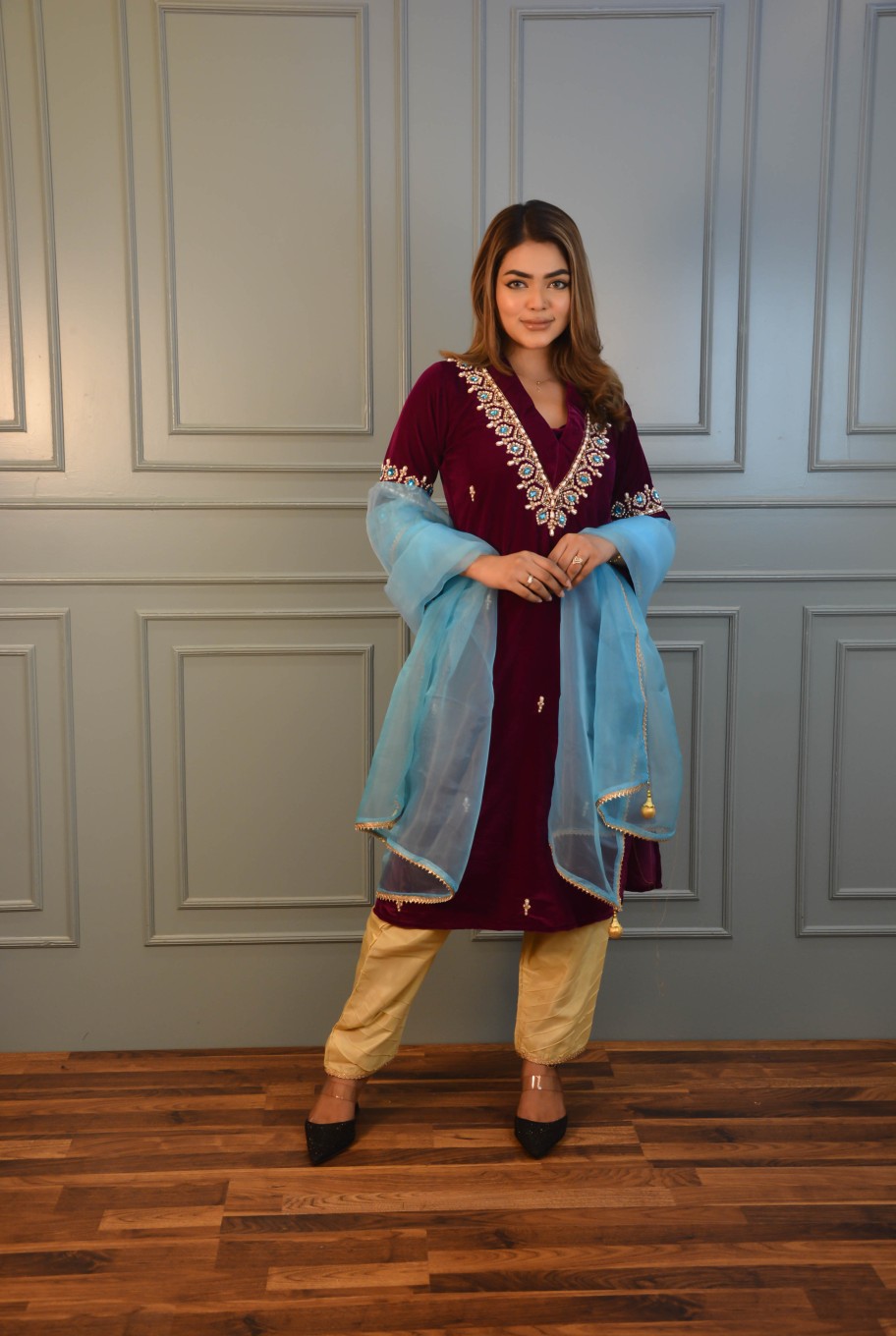 This stitched 2-piece suit presents a soft purple hand-worked velvet kameez with front and sleeve details. The suit includes heavy kerchupi and stonework, it comes with a blue net both-sided golden lace work dupatta with tarsel at ends. This combination of colors and textures creates a harmonious and stylish suit perfect for formal events, blending elegance with a touch of modernity.